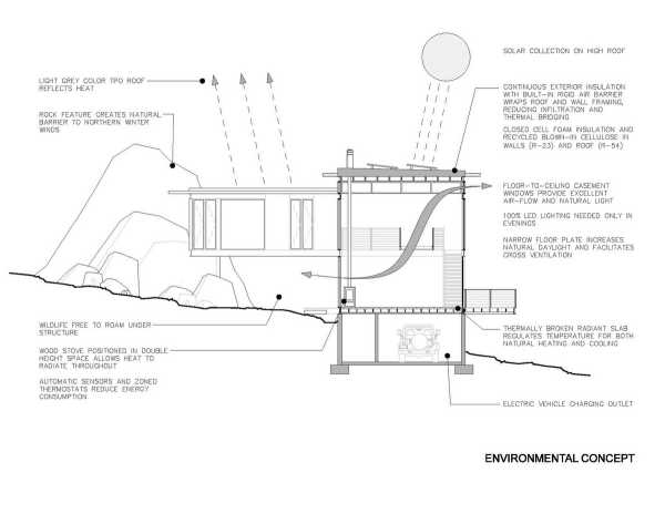 У будинку є низка протипожежних елементів. По-перше, зовнішня оболонка має вогнестійку конструкцію, що включає бетонну основу, сталеву раму та сталеву обшивку. Прямо під покрівельною мембраною є шар високопродуктивних гіпсових покрівельних плит під назвою DensDeck. Плити відомі своєю міцністю та негорючим. Цей матеріал був використаний для обробки дерев'яних стель будинку. Команда дизайнерів також усунула місця, де могли збиратися листя та хвоя. У будинку студія встановила автоматичну систему пожежогасіння. Розміщені поряд з дерев'яними кроквами, зрошувальні головки пофарбовані в чорний колір і є елементом промислового дизайну. Звиси даху допомагають затіняти великі ділянки скла. Стіни та каркас даху обернуті суцільною зовнішньою ізоляцією з вбудованим жорстким бар'єром, що допомагає утворювати повітронепроникну оболонку. Будинок опалюється дров'яною піччю та випромінювальною системою в бетонній плиті. Вікна, що відкриваються, дозволяють свіжому повітрі циркулювати в теплі місяці. Електроенергія забезпечується сонячною батареєю потужністю чотири кіловати на даху. Високоефективна побутова техніка, світлодіодне освітлення, що регулюється, і велика кількість денного світла допомагають мінімізувати споживання електроенергії. У навісі є зарядна розетка для електромобілів.