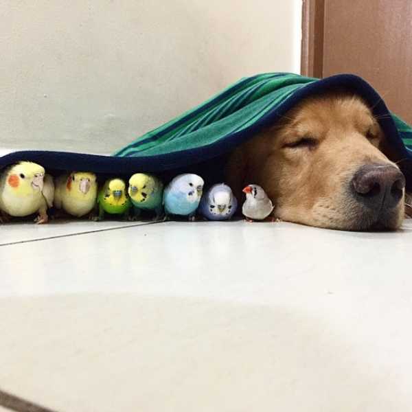 Цього доброзичливого золотистого ретрівера звуть Боб. Він живе у Сан-Паулу, у Бразилії, разом зі своїм господарем, хом'яком та 8 різномастими птахами.