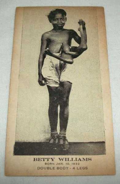 Бетті Лу Вільямс народилася 1932 року. Вона була рідкісною нагодою в медицині: з її тіла росли ноги і таз її сестри-близнюка, що недорозвинулася, чия недорозвинена голова жила в тілі дівчинки. У фрик-шоу Бетті заробляла шалені 1000 доларів на тиждень. На ці гроші вона купила батькам величезну ферму та відправила всіх своїх братів та сестер навчатися у коледжі. Бетті Вільямс померла у 23 роки, задихнувшись під час нападу астми.