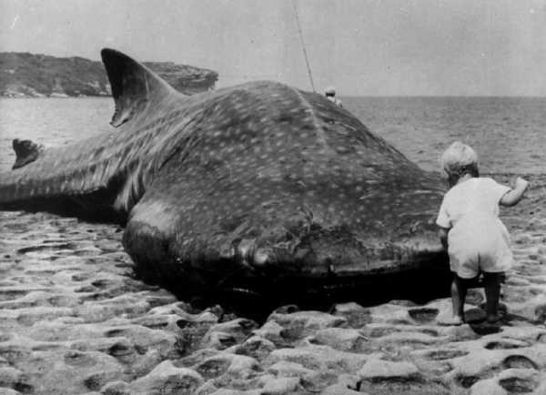 Маленька дитина та гігантська китова акула викинута на берег Австралії, 1965 рік.