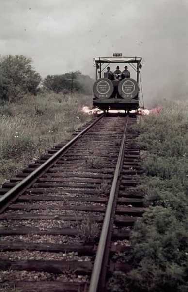 Робітники залізниці рухаються у вагоні для випалювання бур'янів. Техас, червень 1941