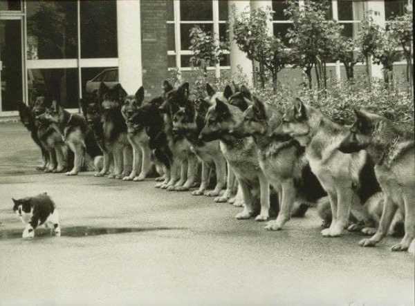 Кіт і дресовані німецькі вівчарки – фінальний іспит для поліцейських службових псів. ФРН, 1987 рік.