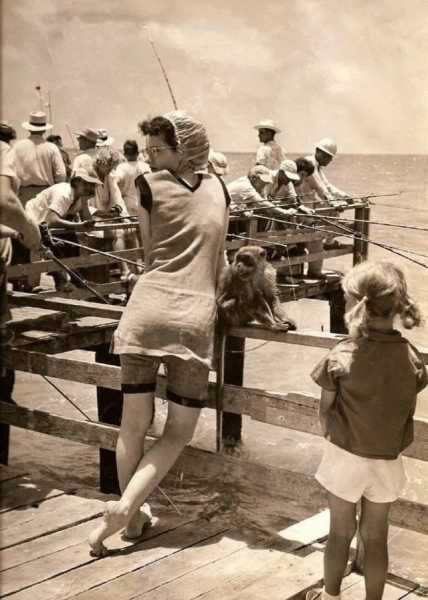 Дівчина в старовинному купальнику з мавпочкою на пляжі, 1949 року.