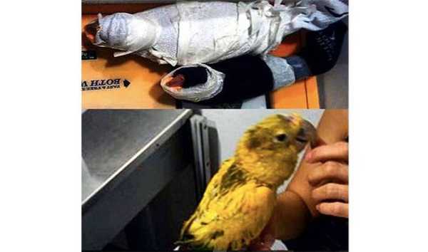 Екзотичні птахи, обгорнуті в носки і прикріплені до тіла пасажирки, аеропорт Лос-Анджелес.