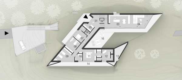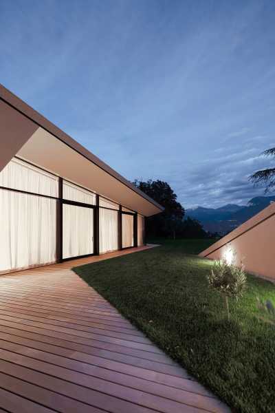Господарі садиби бажали звести сучасний дім на узвишші, звідки відкривається дивовижний вид на навколишній альпійський пейзаж. Оформлення споруди узгоджується з її розташуванням серед дерев та виноградних лоз і орієнтоване на долину в напрямку озера Кальдаро. Кутаста структура, здається, виростає з-під землі на вершині пагорба, а її похилі стіни м’яко з’єднуються з покрівлею. Підковоподібний план охоплює внутрішній двір, прикритий від вітрів, що переміщаються долиною з озера на південь. Зовнішні площини будівлі відтворюють колір і фактуру підпірних мурів з вапнякового каменю, що трапляються на виноградниках, які знаходяться навколо. Широка під’їзна дорога переходить у схожий на печеру гараж, інтегрований у похилий рельєф, а сходи ведуть вгору схилом до головного входу в оселю.