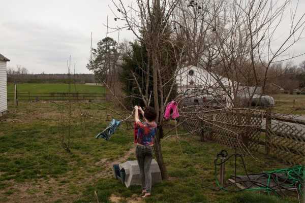 Едем розвішує випраний одяг, у якому працює, на дереві у дворі.