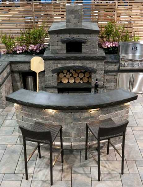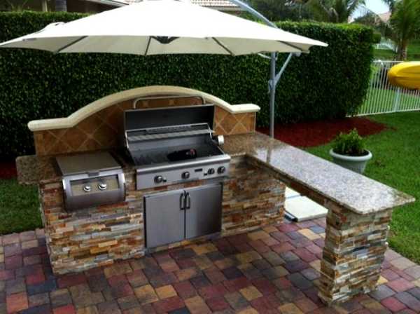 Компактна кухня з природного каменю з мангалом і кутовою барною стойкою – чудова задумка для організації приготування їжі просто неба.