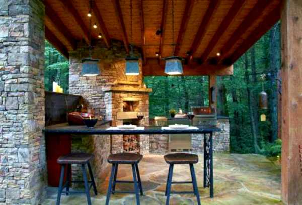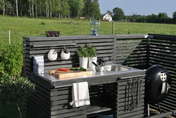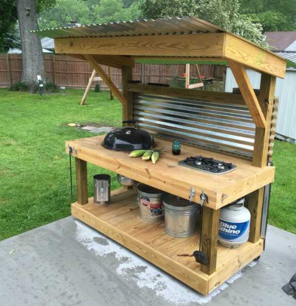 Функціональна та досить симпатична кухня в літньому стилі, яку можна створити з дерев’яних стовпів і листів металопрофілю. Маючи таку споруду на своїй ділянці, ви зможете готувати на вулиці, не боячись погодних негараздів.