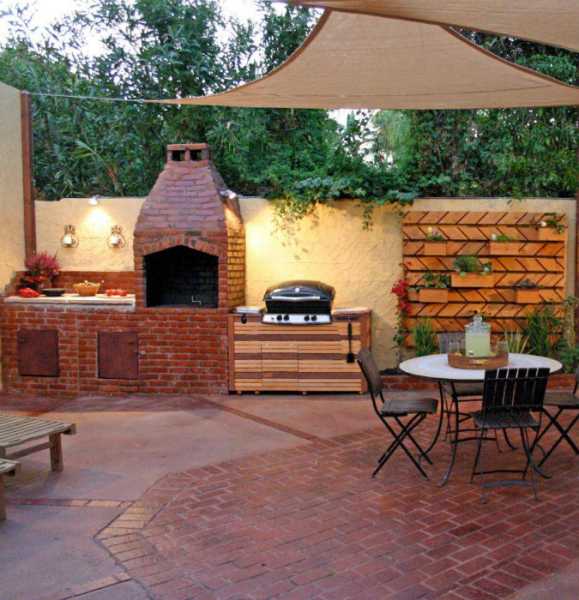 Велике літнє патіо з пічкою з червоної вогнетривкої цегли, барбекю і невеликою робочою зоною.