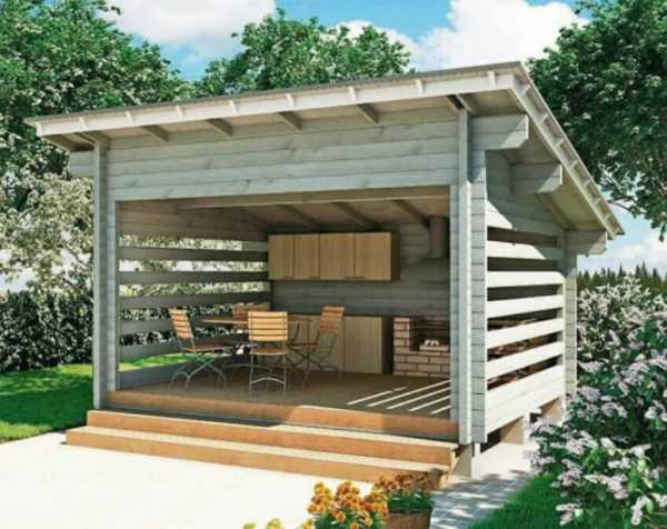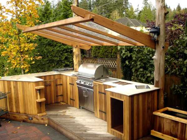 Незвичайна літня кухня з дерева з невеличким козирком, який дасть змогу продовжувати готування навіть у дощову погоду.