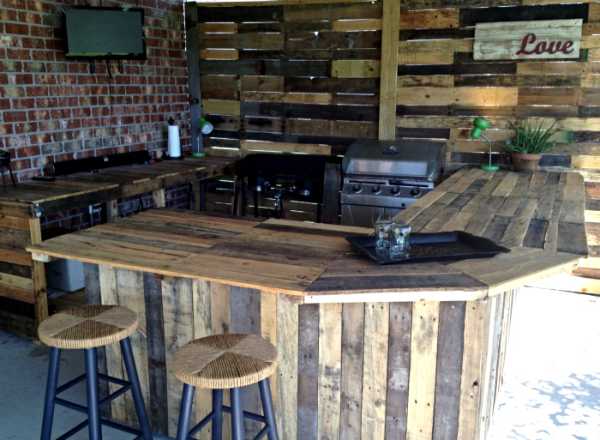 Використайте дошки від непотрібних дерев’яних палет для будівництва невеликої літньої кухні з барбекю і кутовим столом-барною стійкою.