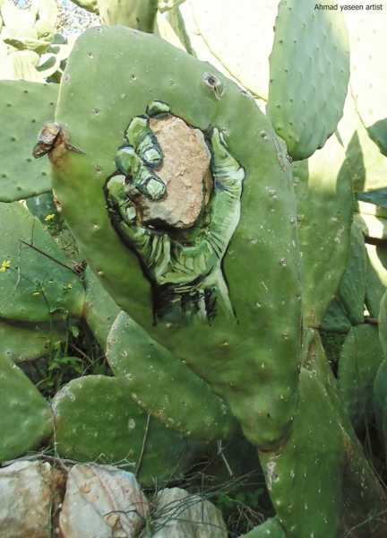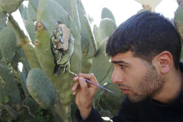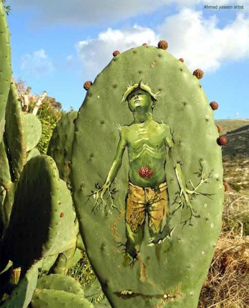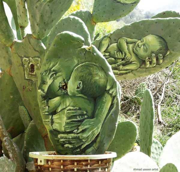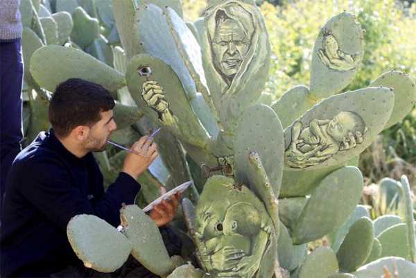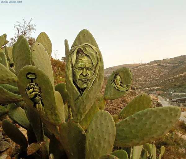 Палестинський митець Ахмад Ясін обрав досить незвичні площини для своїх творів. Він створює дивовижні зображення на кактусах, які ростуть у його особистому саду в селищі поблизу міста Наблус.