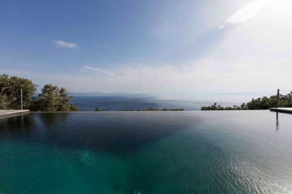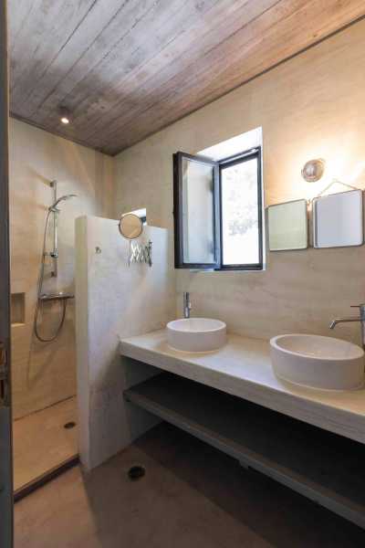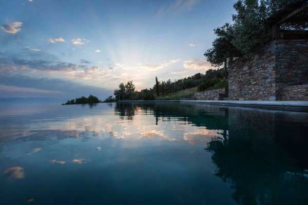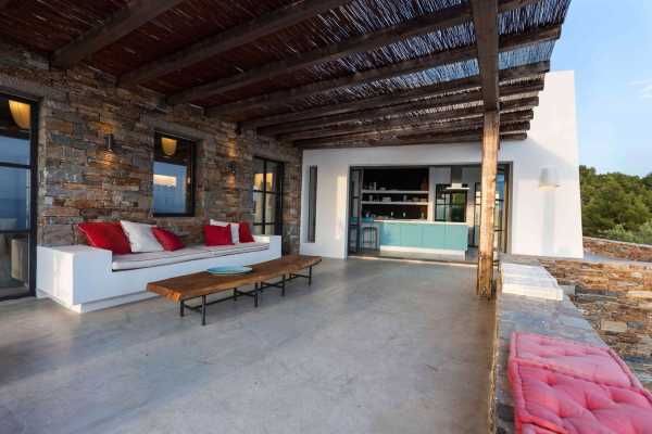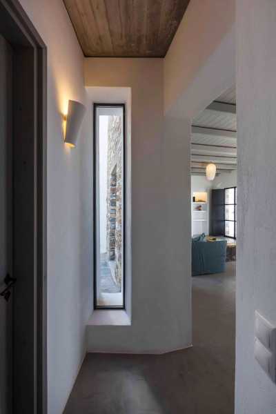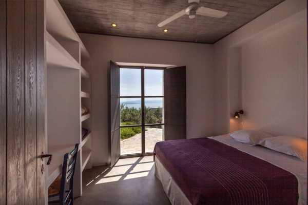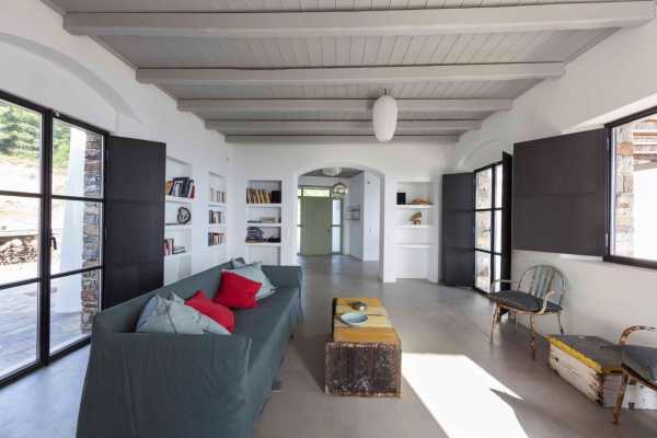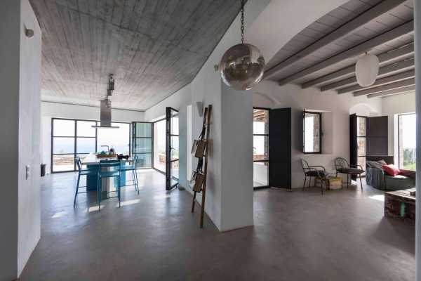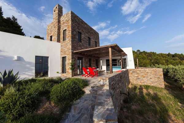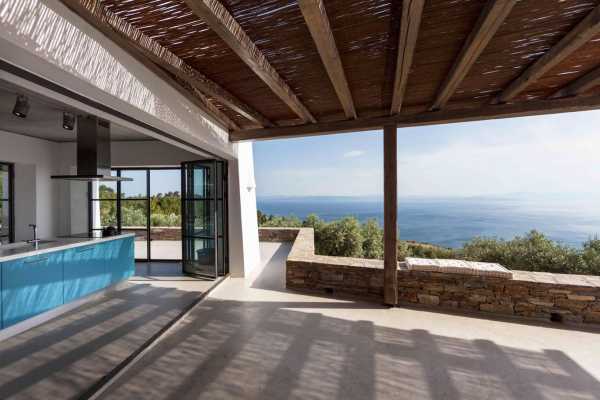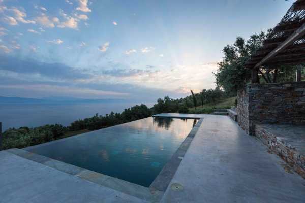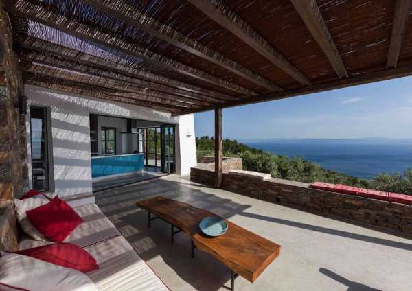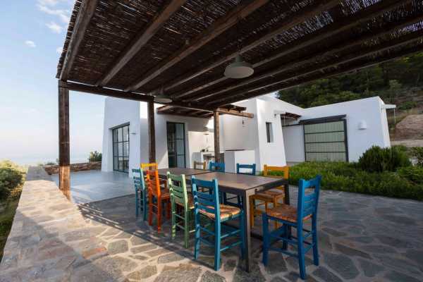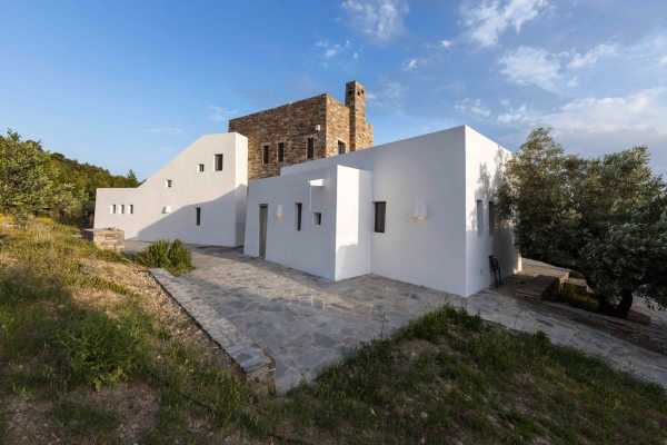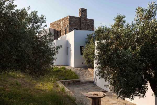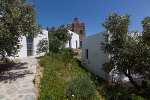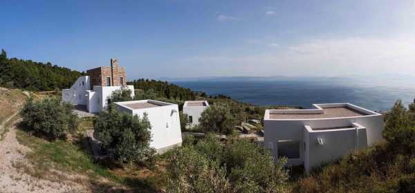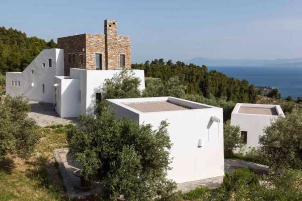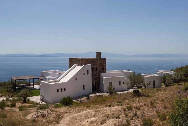 Комплекс будівель для проживання, що складається з чотирьох окремих споруд, розташований на схильній території з оливковими деревами та панорамою на затоку в центрі Греції. Основна будівля має два яруси, в той час як інші є одноповерховими.