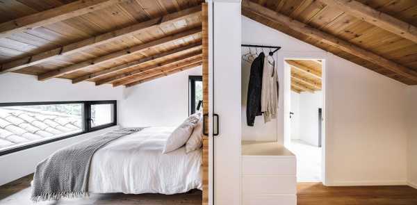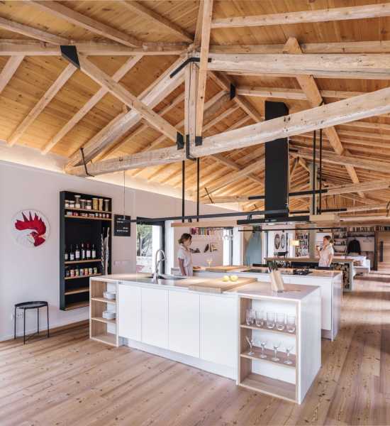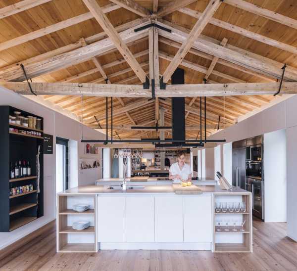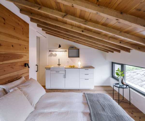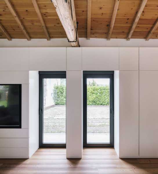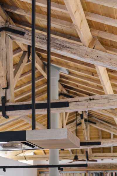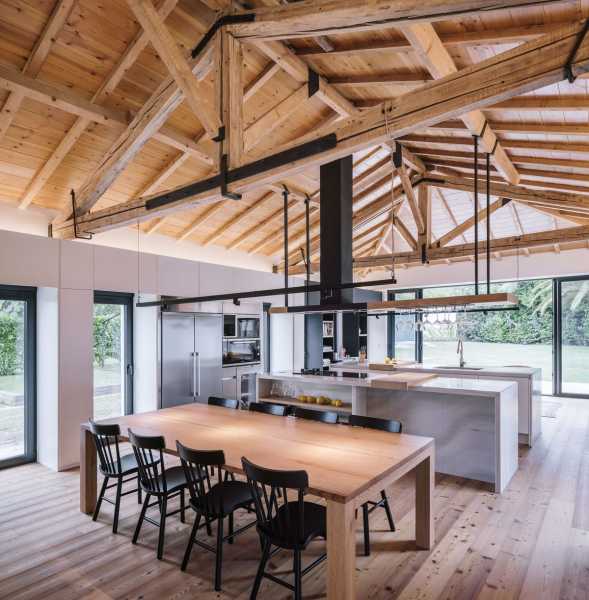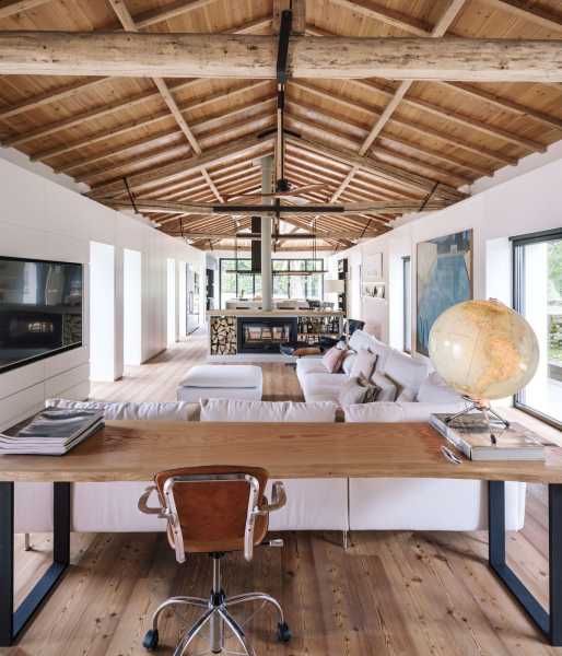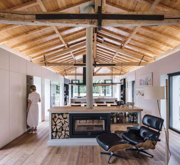 Щоб зберегти відчуття простору від внутрішніх перегородок вирішили відмовитися. Весь простір займають лінійно розташовані громадські зони: кухня з дров'яним каміном, простора їдальня з дерев'яним обіднім столом, вітальня, центром якої є великий кутовий диван ошатного білого кольору та домашній офіс з бібліотекою. Розсувні скляні двері з боку кухні пов'язують будинок із відкритою терасою. Дерев'яні жалюзі, за потреби, забезпечують конфіденційність. Висока стеля з відкритим дерев'яним дахом та старими дерев'яними балками створюють особливу сільську атмосферу, наповнену теплом та затишком. За дерев'яним стелажем домашньої бібліотеки прихована головна спальня з ванною та гардеробною. На верхньому поверсі є ще одна спальня.
