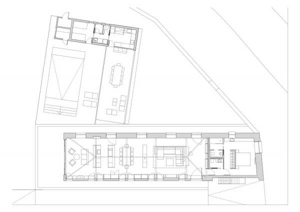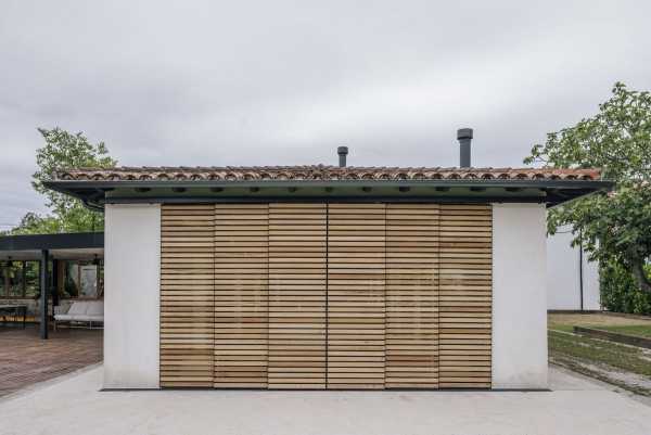 L-подібна нова прибудова відрізняється більш раціональною архітектурою, в той же час зберігає простоту і строгість. Вона відокремлена від існуючого будинку великою критою верандою з чудово обладнаною зоною відпочинку. Між двома будівлями обладнано відкритий басейн із дерев'яною палубою. Прибудова має гостьовий номер і сауну.