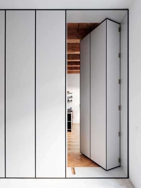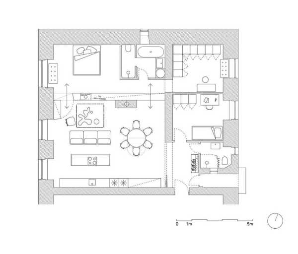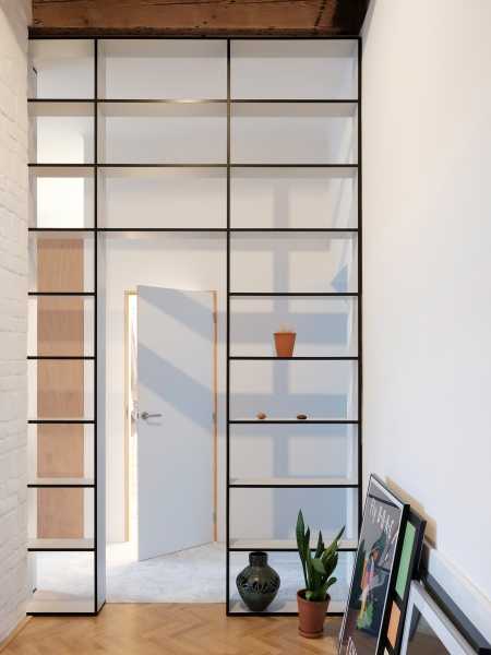 Після короткого процесу проектування стало зрозуміло, що основна увага буде сконцентрована на вітальні. Це відкритий простір з відновленими оригінальними формами стелі та бібліотекою на всю висоту стіни. Частина бібліотеки може обертатися і служить секретними дверима до спальні, розташованої по інший бік стелажу, з'єднуючи дві частини квартири.