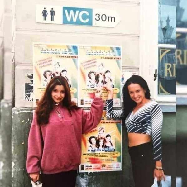 Ольга Орлова та Жанна Фріске на тлі плакатів групи «Блискучі», 1997 рік.