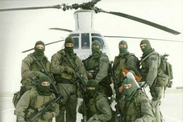 Військові підрозділу FORECON Корпусу морської піхоти США біля гелікоптера CH-46 Sea Knight, 1990-ті роки.