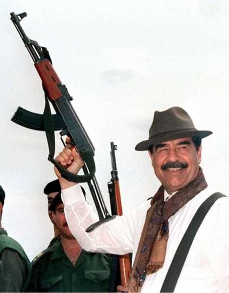 Життєрадісний та енергійний президент Іраку Саддам Хусейн з автоматом АК-47, Ірак, 1990-ті.