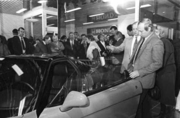 Володимир Путін оглядає новітній Honda NSX на автомобільній виставці. Санкт-Петербург, 29 квітня 1993 року.