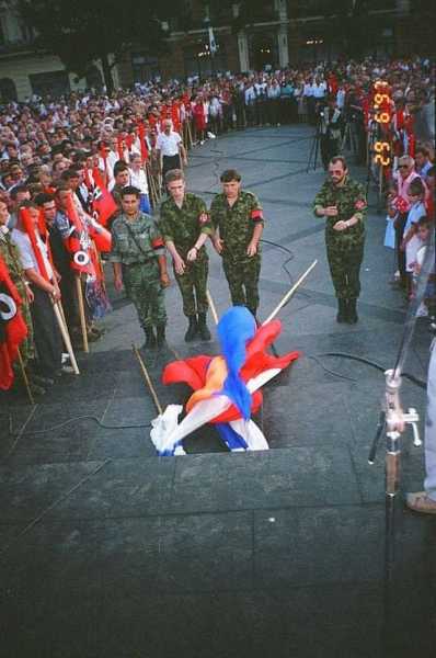 Мітинг УНСО у Львові зі спалюванням прапорів Вірменії, Польщі та Росії, Львів, 1997 рік.