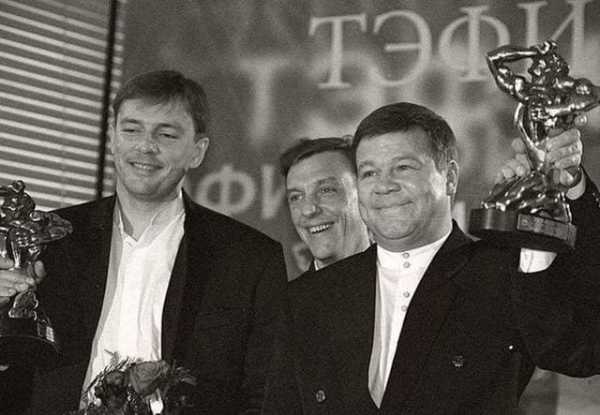 Олексій Нилов, Олександр Половцев і Сергій Селін на церемонії вручення нагороди ТЕФІ-99 за телесеріал «Вулиці розбитих ліхтарів». Росія, 1999 рік.