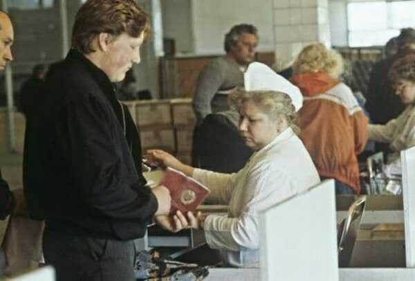 Касир перевіряє наявність московської реєстрації у покупця при продажу дефіцитного продукту. Москва, 1990 рік.