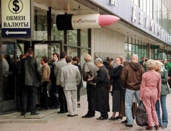 Люди швидко купують долари під час технічного дефолту РФ. Курс рубля впав у 3,5 рази менше ніж за пів року. 1998 рік, Москва.