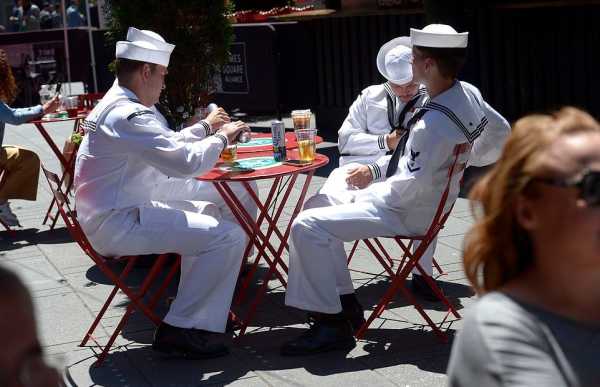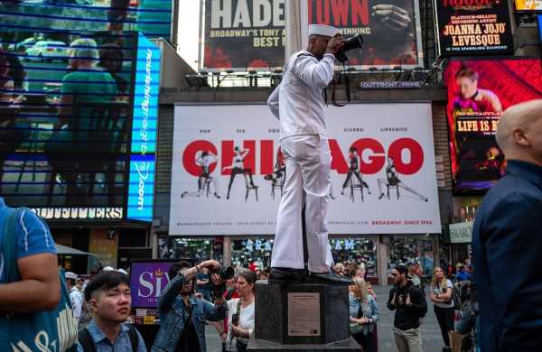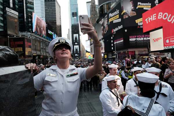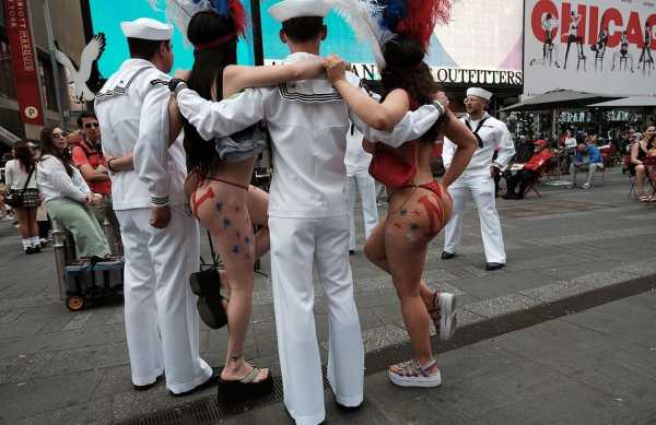 У середу, моряки та морпіхи вишикувалися на її відомих Червоних сходах, а потім вирушили на Бродвей, щоб фотографуватися з голими художницями та іншими колоритними особистостями цього району.