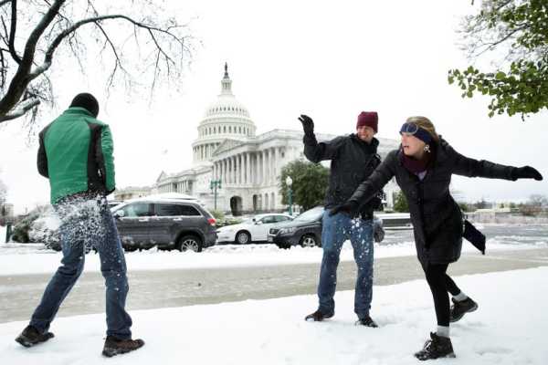 Туристи бавляться в сніжки поблизу Капітолію у Вашингтоні, округ Колумбія, 14 березня 2017 року.