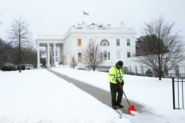 Співробітник Служби національних парків США прибирає сніг з доріжки біля Білого дому у Вашингтоні, округ Колумбія, 14 березня 2017 року.