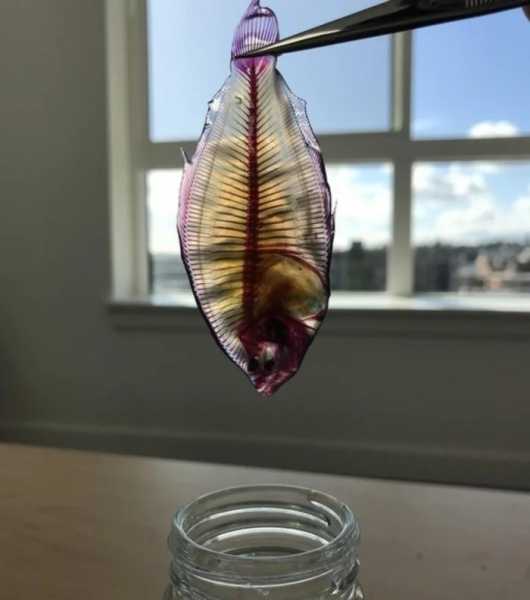 Рибка після хімічного процесу: посинілі хрящі, червоні кістки і прозора шкіра та органи