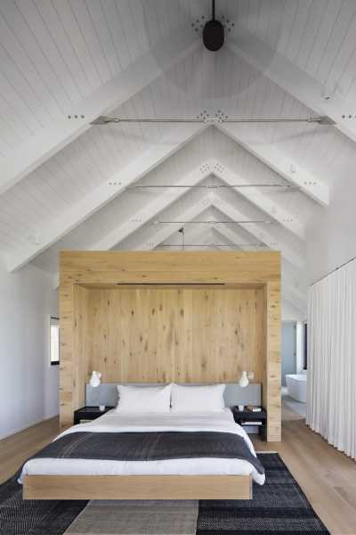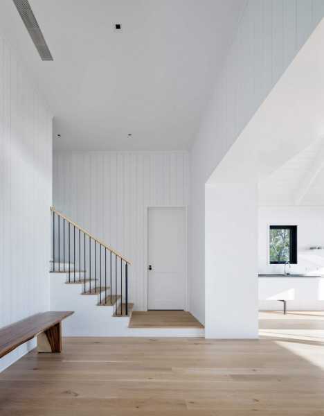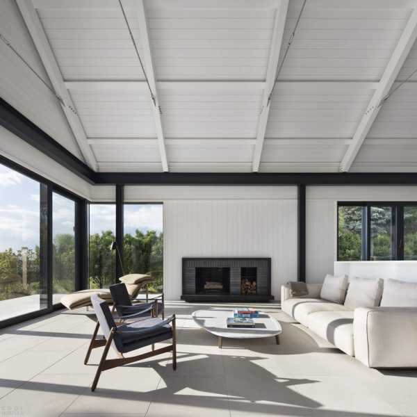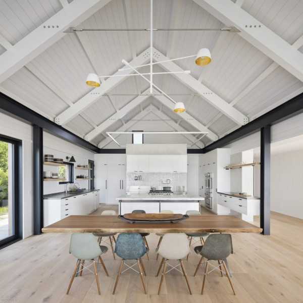 Відкрита структурна сталева рама чорного кольору охоплює великі простори енергозберігаючого скла та підтримує важкий масив стельових балок, пофарбованих у білий колір. В інтер'єрі домінує деревина світлих тонів: підлога покрита дошками світлого тону, а стіни забарвлені у білий колір. Меблі та предмети декору також підібрані у світлих тонах. Нейтральна палітра білих та вибілених лісів виглядає неймовірно привабливо та стильно. Використання в інтер'єрі гри контрастів – старого та нового, колірних та текстурних, привносить до нього свіжість та виразність. Поєднання гладких та грубих пофарбованих дерев'яних дощок, марокканської плитки ручної роботи та європейського білого дуба підкреслює тісну взаємодію архітектури та природи.
