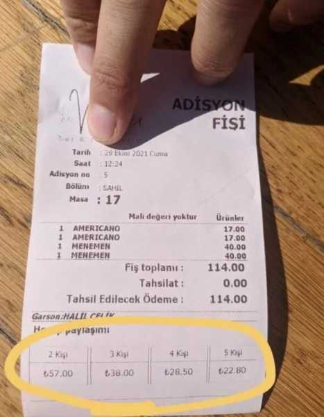 У Туреччині є ресторан, в чеках якого показано, як можливо легко поділити рахунок, і вам не доведеться робити ніяких обчислень