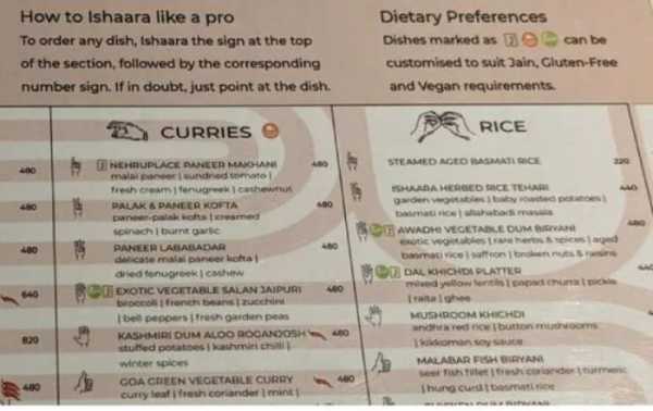 В Індії в одному з закладів висить чимала табличка з роз’ясненням, як зробити замовлення мовою жестів