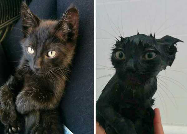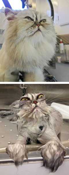 Мокра шерсть напрочуд позбавляє звірят їх величності та гордості, доказом цьому слугують ці кумедні світлини. Проте дехто з хазяїв безсумнівно пошкодує про зроблене.