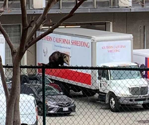Опосум, який чудово розташувався в кадрі з автомобілем, сидячи на огорожі