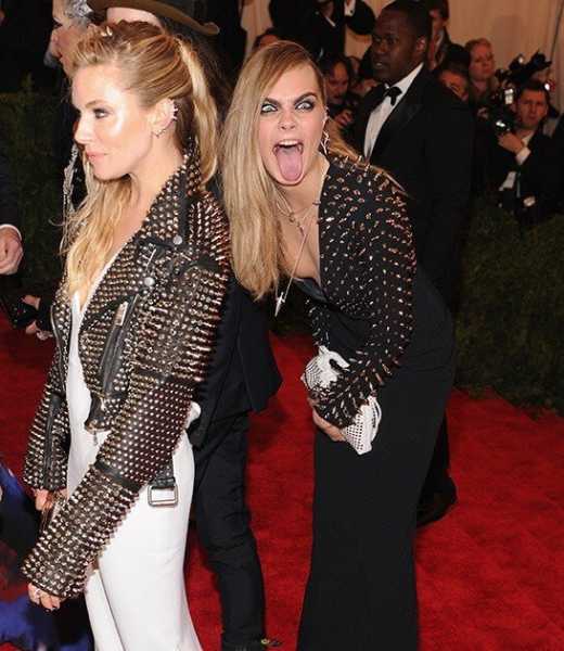 Кара Делевінь кривляється під час позування на червоній доріжці Сієнни Міллер